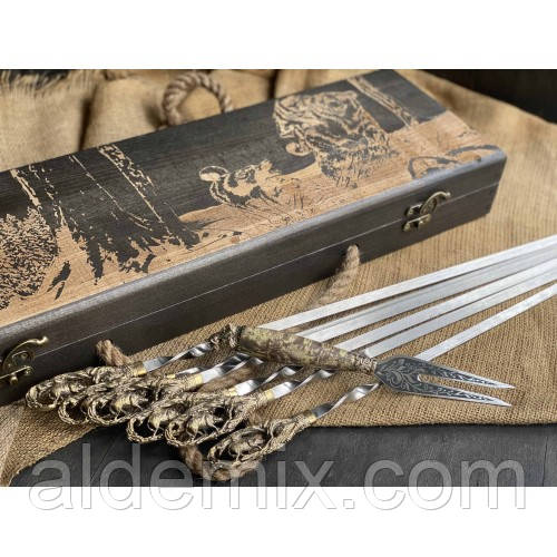 - Шампура: 6 штук, тверда харчова сталь, товщина 3 мм. Довжина шампура: загальна-60 см; робоча-40 см. Рукоятка: ювелірне художнє лиття з бронзи (при використанні ручка не нагрівається).